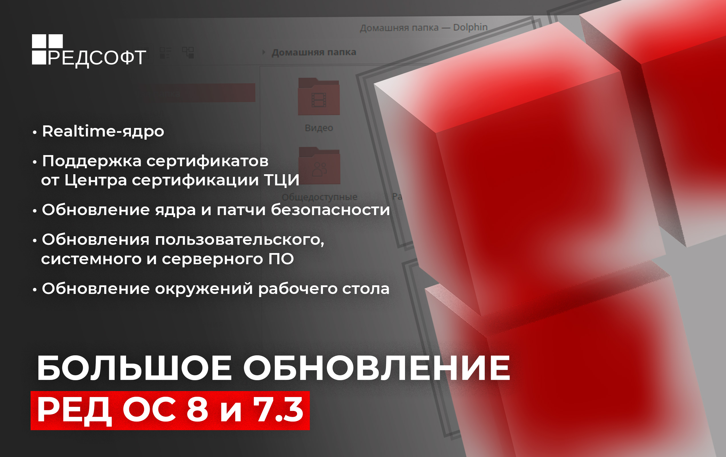 23 декабря 2024 г. — Компания «РЕД СОФТ» выпустила обновление операционной системы РЕД ОС Стандартной редакции версий 8 и 7.3. Появилась поддержка Realtime-ядра и корневых сертификатов Российского Центра Сертификации ТЦИ, по умолчанию внедрен ряд рекомендаций ФСТЭК России.
